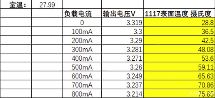 把某品牌AMS1117的温升详细做测试,结果如下图: