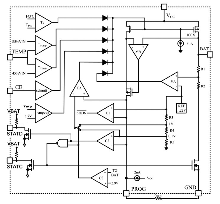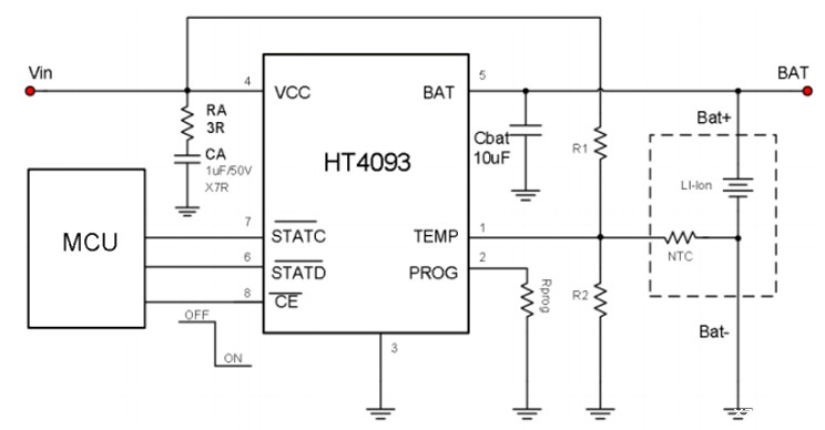HT4093 由于专为 MCU 设计,具有其他充电芯片不具有特点,包括:钳位电压不高于电池电压的信息电平、自带下拉的低电平使能适合 0V 充电、CE、PROG 中途停止控制电池充饱电压,OVP 信息传送,支持任意低于充饱电压重上电充电。其它特点包括:电源 OVP(过压保护)、输入欠压锁定、自动再充电、CE 使能端控制、电池反接保护、手动停机、充电状态双输出、无电池和故障状态显示等。